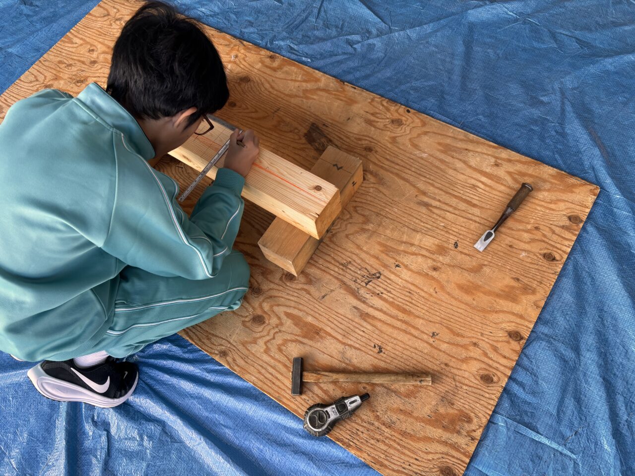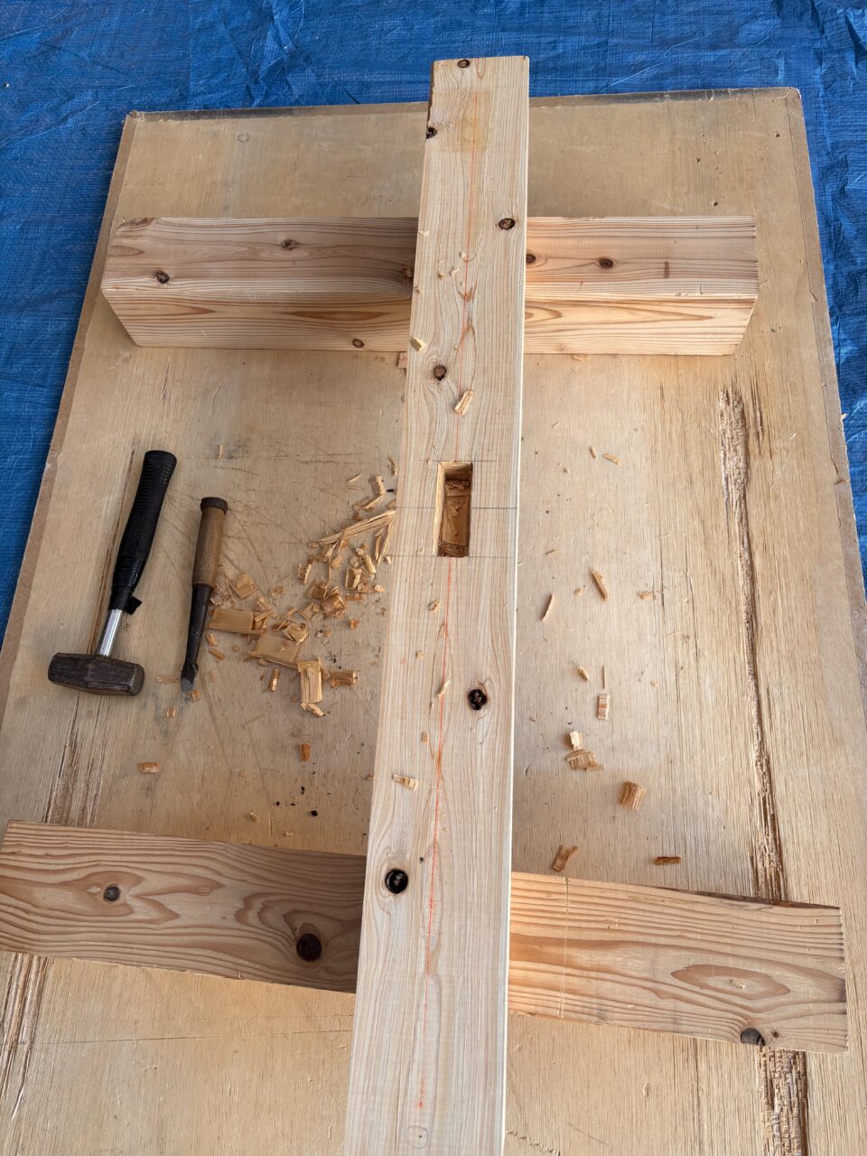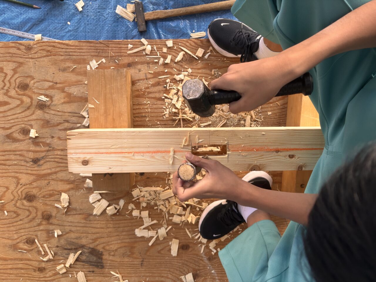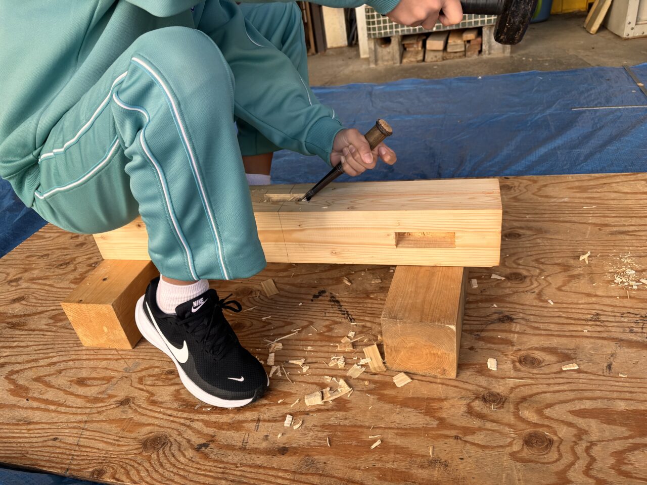 2日目は、ホゾ穴の墨付けから刻み・加工まで、ノミと玄能を使っての木工にチャレンジ。