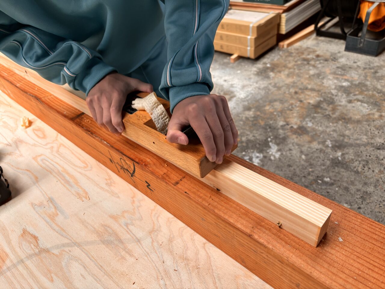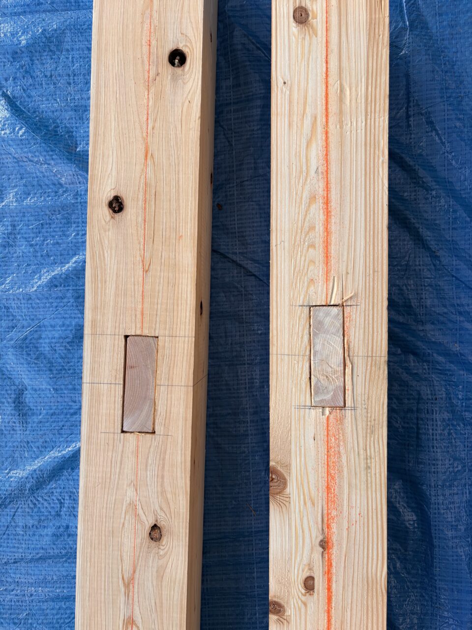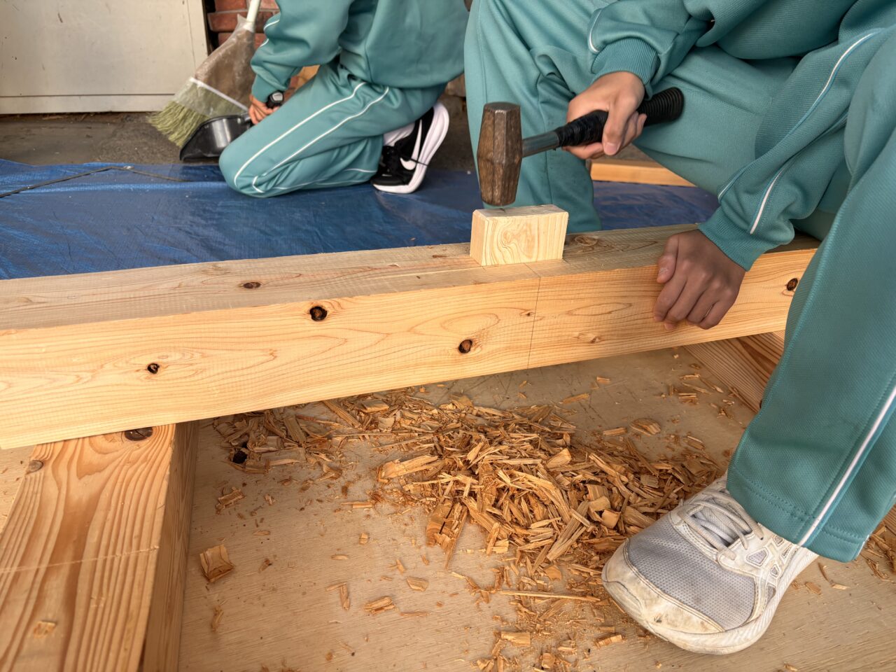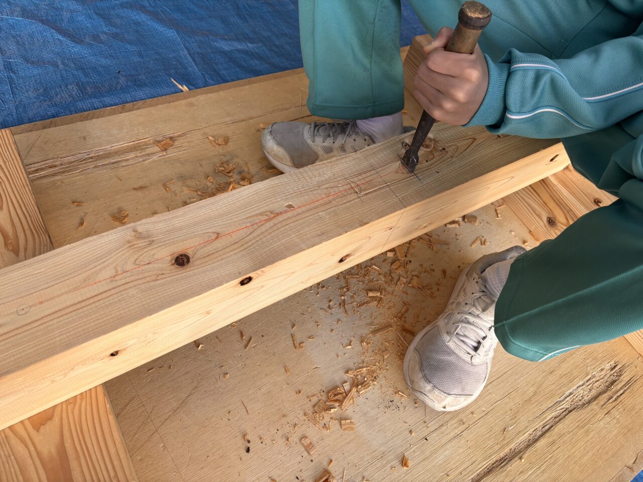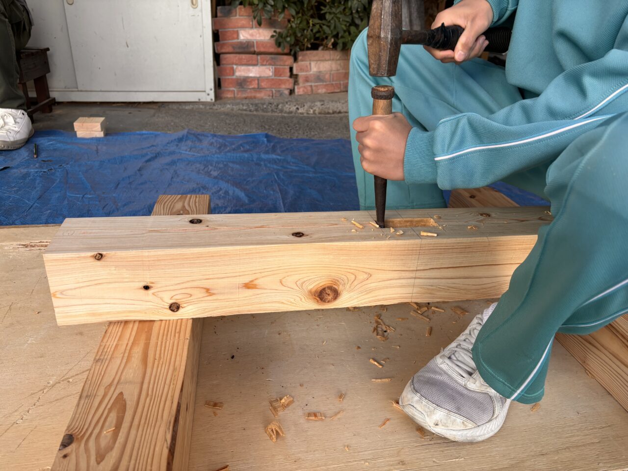 2日目は、ホゾ穴の墨付けから刻み・加工まで、ノミと玄能を使っての木工にチャレンジ。